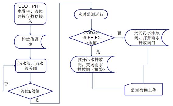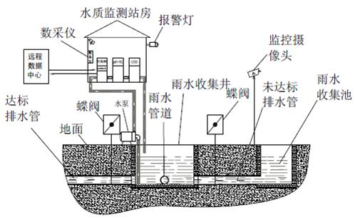 監(jiān)測(cè)系統(tǒng)控制采樣單元將水樣導(dǎo)入監(jiān)測(cè)室,并啟動(dòng)監(jiān)測(cè)水質(zhì)的COD、pH、電導(dǎo)率等常規(guī)參數(shù)。達(dá)標(biāo)雨水通過電控閥門排入市政雨水管網(wǎng),一旦超標(biāo)電控閥門關(guān)閉,禁止雨水排入市政雨水管網(wǎng),并通過水泵將超標(biāo)雨水泵入企業(yè)污水處理系統(tǒng)處理,達(dá)標(biāo)后排放至市政污水管網(wǎng)。同時(shí)所有監(jiān)測(cè)數(shù)據(jù)經(jīng)由數(shù)據(jù)采集單元將數(shù)據(jù)統(tǒng)計(jì)后,由傳輸設(shè)備傳輸至企業(yè)監(jiān)測(cè)中心或環(huán)保局,由此完成對(duì)雨水排放自動(dòng)、實(shí)時(shí)、連續(xù)監(jiān)控。