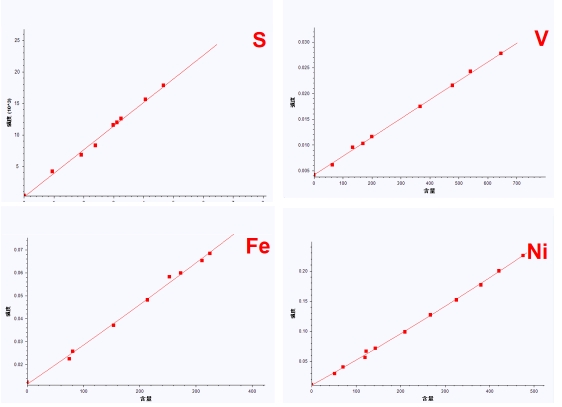 圖2:S、V、Fe、Ni元素含量與強(qiáng)度線(xiàn)性關(guān)系圖