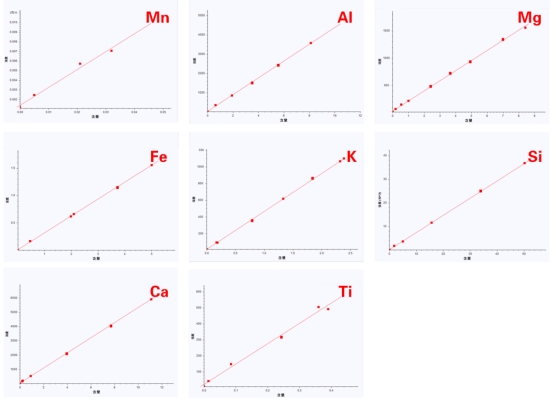 設(shè)定適當?shù)臏y量條件,使用X射線熒光光譜儀掃描一系列含量已知的石墨標準物質(zhì)或石墨二次標樣,該系列樣品中需關(guān)注元素Mg、Al、Si、K、Ca、Ti、Mn、Fe等元素含量與強度的一次線性校正工作曲線。然后,對未知石墨樣品進行測量。