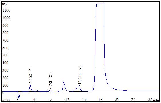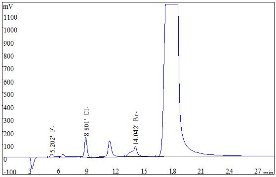 準(zhǔn)確稱取0.2g(精確至0.0001g)試樣,采用氧彈燃燒后冷卻定容,經(jīng)0.22μm的水系濾膜過濾后上機(jī)得到測(cè)試譜圖如下圖2、圖3所示。