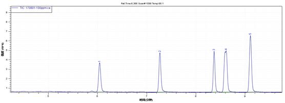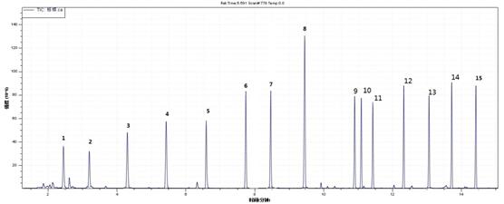 1.正己烷 2. 3.三氯乙烯 4.甲苯 5.辛烯 6.乙酸丁酯 7.乙苯 8.對(間)二甲苯9.鄰二甲苯 10.苯乙烯 11.壬烷 12.異辛醇 13.十一烷 14.十四烷 15.十六烷