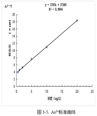 圖4為5.0μg/L混和標(biāo)準(zhǔn)溶液色譜圖,以各形態(tài)峰附近基線處的3倍信噪比(S/N)峰高對應(yīng)的濃度作為檢出限,AsC、As3+、DMA、MMA、As5+分別為0.078μg/L、0.10μg/L、0.11μg/L、0.13μg/L、0.16μg/L。