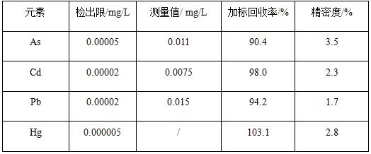在碰撞反應(yīng)模式下,以內(nèi)標(biāo)法校正儀器信號漂移,將配制好的各元素標(biāo)準(zhǔn)溶液上機(jī)測試,繪制標(biāo)準(zhǔn)曲線,各元素標(biāo)準(zhǔn)工作曲線線性相關(guān)系數(shù)R>0.999;對樣品空白溶液平行測定11次,計算11次樣品空白值的標(biāo)準(zhǔn)偏差,并以三倍標(biāo)準(zhǔn)偏差/工作曲線斜率表示檢出限;間隔2min,對樣品平行測定7次,計算7次測試結(jié)果對應(yīng)的相對標(biāo)準(zhǔn)偏差,表示精密度;對樣品進(jìn)行加標(biāo)實(shí)驗,并計算加標(biāo)回收率。各元素檢出限為0.000005~0.00005mg/L,加標(biāo)回收率為90.4%~103.1%,精密度為1.7%~3.5%。
